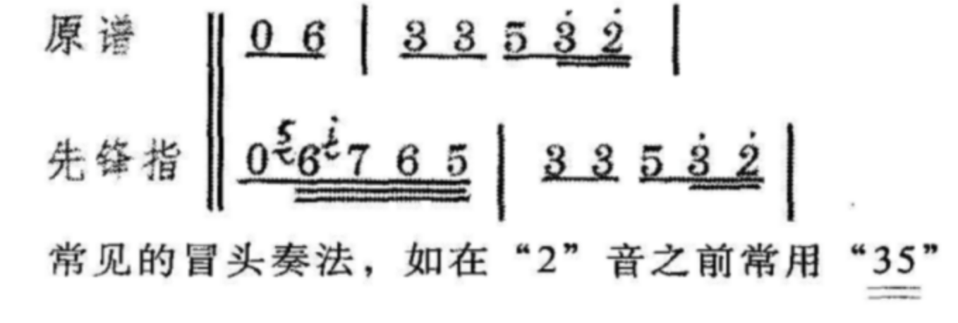 箫在广东音乐乐曲中以揉、滑、倚、颤为主要技巧,箫和高胡在旋律方面的你繁我减、你高我低、加花衬托、对比补充等手法达到水乳交融的效果。比如“冒头”和“迭尾”等装饰音方法,极富特色。“冒头”也称“先锋指”,是在某一乐句开始之处用作引导和连接的装饰音。例如《平湖秋月》的原谱和加“冒头”的对照: