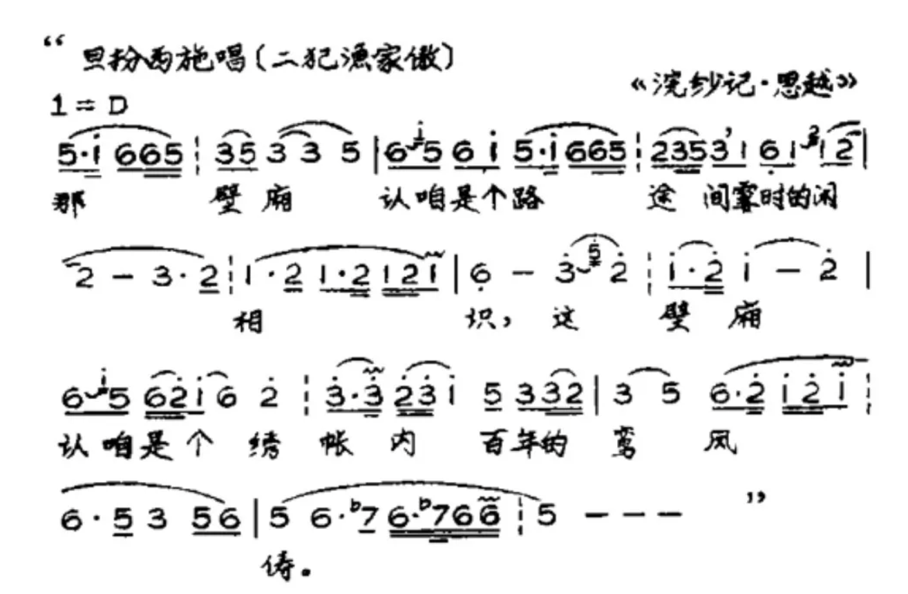 至于老生、花脸所唱带赠板的南曲,如《牧羊记·小逼》中卫律和苏武对唱的前三段【桂枝香】以及《荆钗记·男祭》中小生王十朋所唱带赠板的北曲【折桂令】一段,这都属于极个别的唱例。此外,南曲中也有一些未经雕琢的短小曲牌,如【缕缕金】【香柳娘】【水红花】【红芍药】【会河阳】等,这些曲牌基本都用于叙述或小过场的情节。