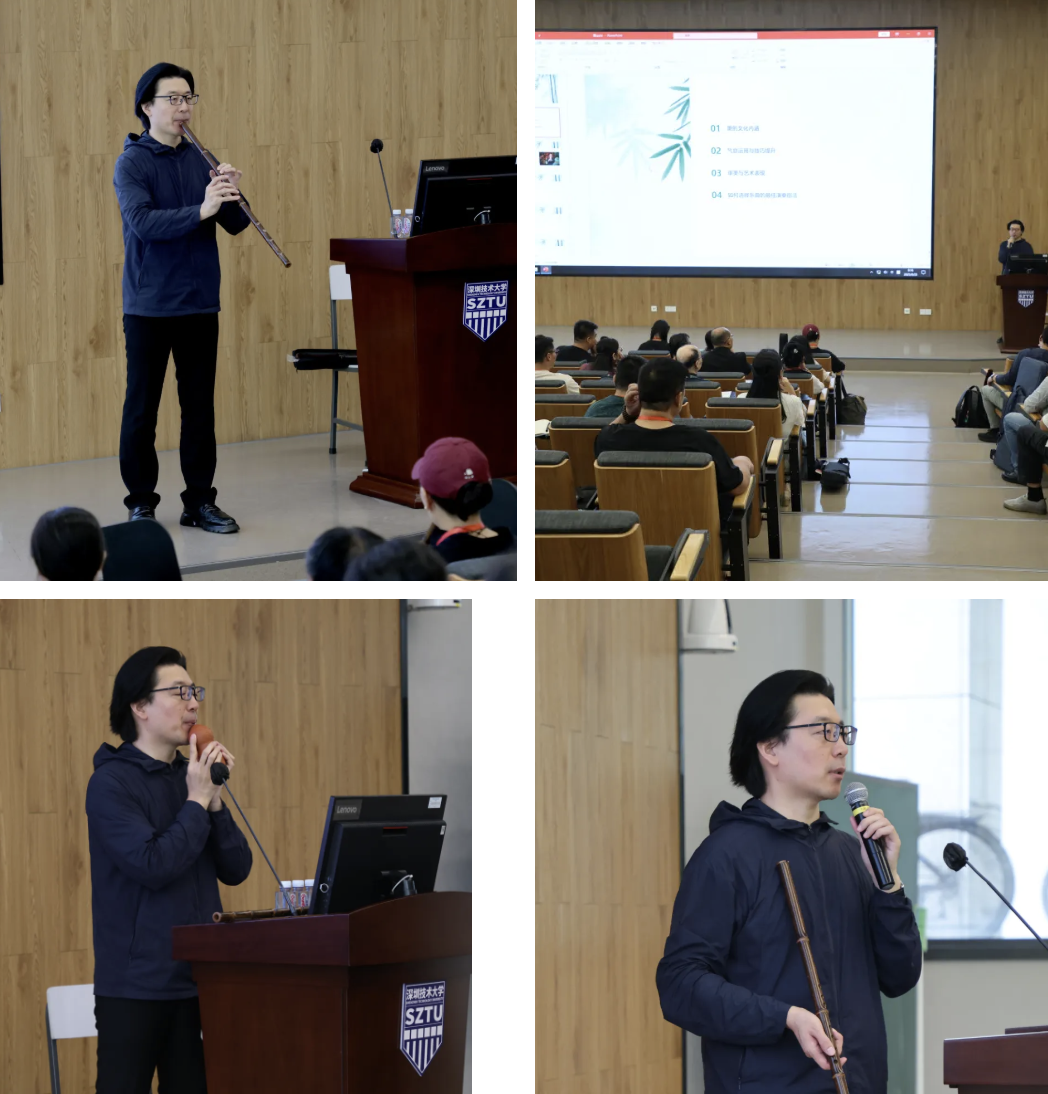 9月23日上午,石磊老师的课程围绕箫与埙两大传统乐器展开,分别以 “清音如梦话竹箫”“厚土之声” 为主题。箫的教学部分,先阐述其文化内涵:音声清幽深远,象征隐逸与高洁,曾在古代礼乐中彰显等级秩序与教化功能,还融入历代诗词书画传承中华文化意蕴;再讲解气息运用与技巧提升,解析洞箫与南箫的风格差异、传统与现代作品的区别,以及常用指法与调性转换及选择依据。埙的教学则涵盖起源与文明印记、形制演变、演奏技巧。讲座中还通过赏析《孤烟直》《春叙》说明其声音特性与技法旋律的配合。