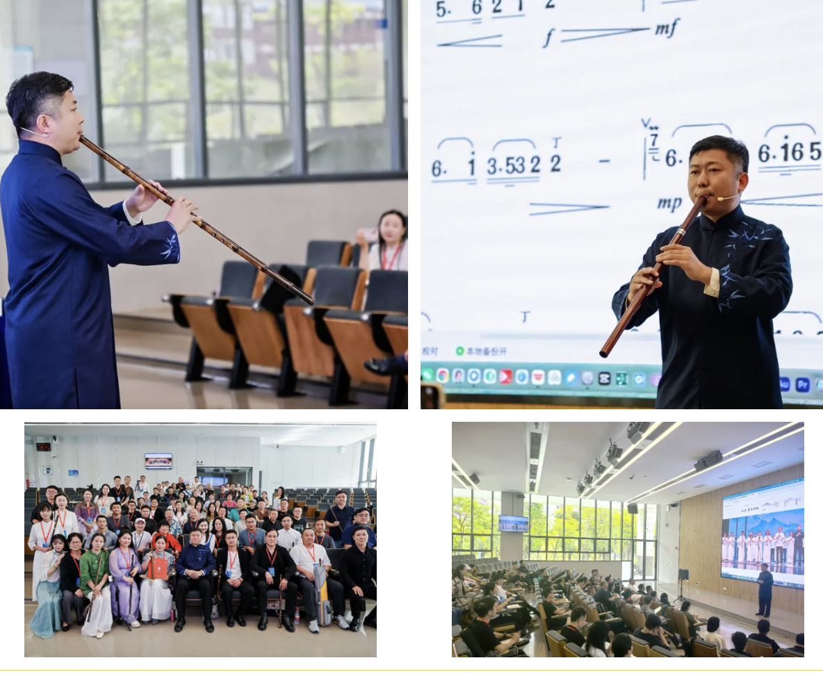 9月23日上午和24日上午,王次恒老师分别通过现场和线上讲座的方式,核心围绕箫的演奏技巧与二度创作展开。他先提及箫与埙作为中国古老乐器,音色柔和优雅且具内敛古朴韵味,气息运用是关键,需做到 “骨肉并重” 以让声音兼具穿透力与感染力。讲座强调技术是音乐表达的支撑而非全部,演奏者需理解作品结构、色调与旋律线条,初学可借助模仿,进阶则要融入个人理解,同时需夯实音乐理论与相关文化基础。他指出气息是 “二度创作的生命线”,要 “意在气先”,依音乐力度、色调调整呼吸与口型,气震音能增强音乐歌唱性。
