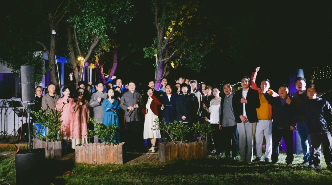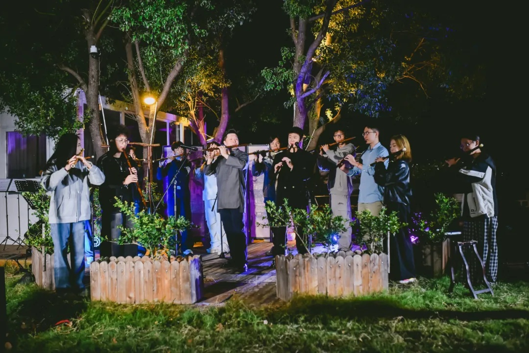 《灯月交辉》《平沙落雁》《傍妆台》等经典曲目尽显传统韵味,或融江南丝竹的温润,或绘秋江雁鸣的诗意;《胡笳》以箫筝和鸣复刻千年苍凉意境,《秋江夜泊》创新融合电子音乐,让传统与现代碰撞出别样火花;压轴曲《姑苏行》更是将氛围推向高潮,张健教授率先擫箫领奏,清亮箫声如太湖晨光穿透薄雾,众学员紧随其后笛箫和鸣,熟悉的旋律伴着稻田清香与太湖湖风在草坪上回荡,尽显师生传承温情。