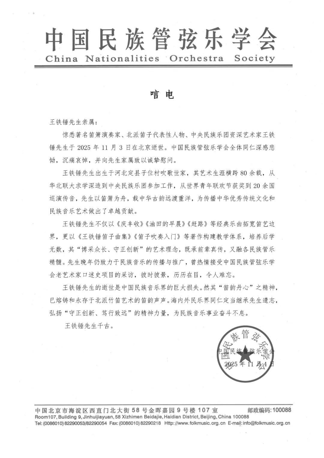 王铁锤先生的逝世是中国民族音乐界的巨大损失。海内外民乐界同仁定当继承先生遗志,弘扬“守正创新、笃行致远”的精神力量,为民族音乐事业奋斗不息!
