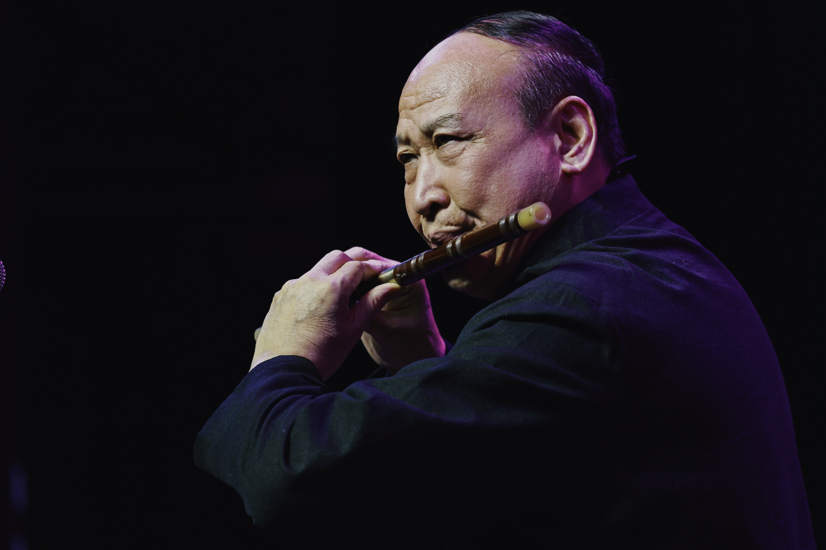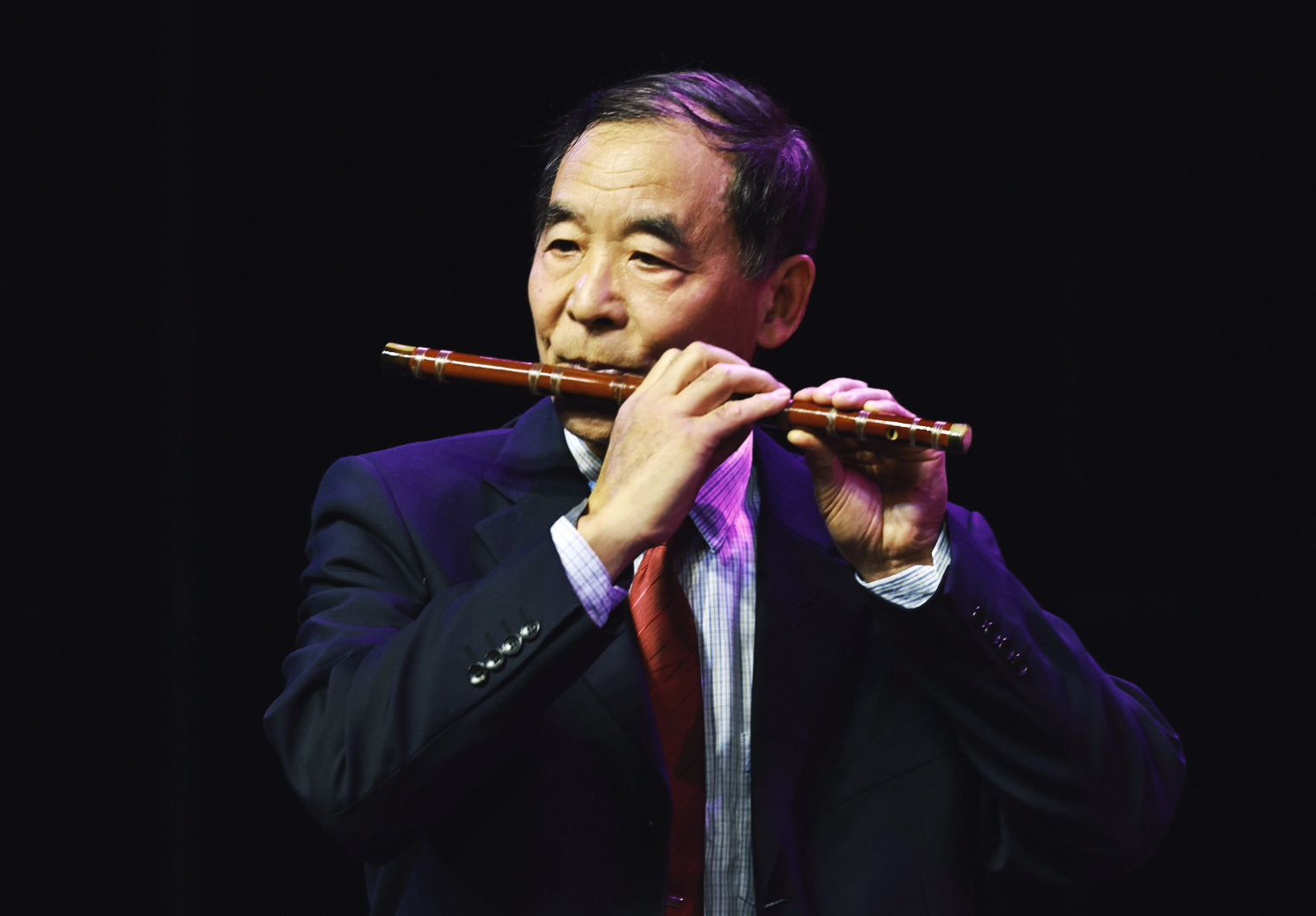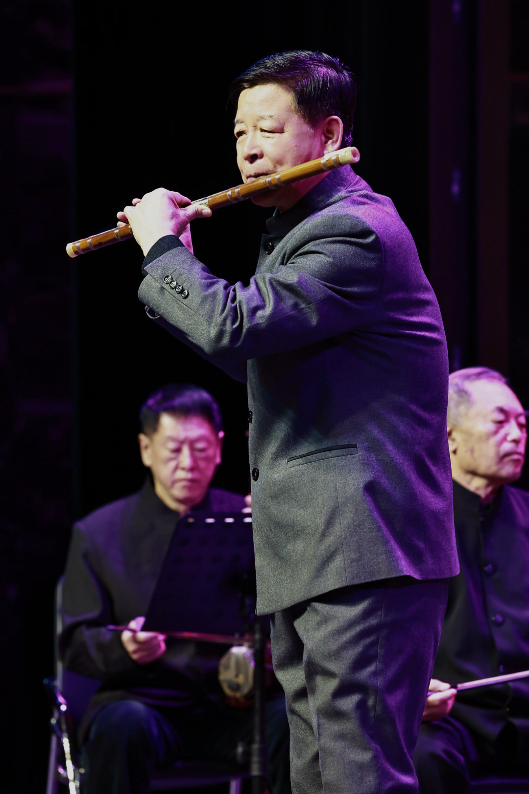 四位德高望重的耄耋前辈袁征、刘同考、安义顺、张荣华联袂演绎的《五梆子》堪称全场亮点。这首经冯子存先生改编的民间曲牌,在四位前辈的合奏中尽显北派笛乐的豪迈洒脱,埙乐艺术非遗传承人张荣华先生临时代替受伤的冯学礼老师登台,与三位老友默契配合,用数十年沉淀的技艺赢得全场起立致敬,关宝光的笙伴奏更添韵味。