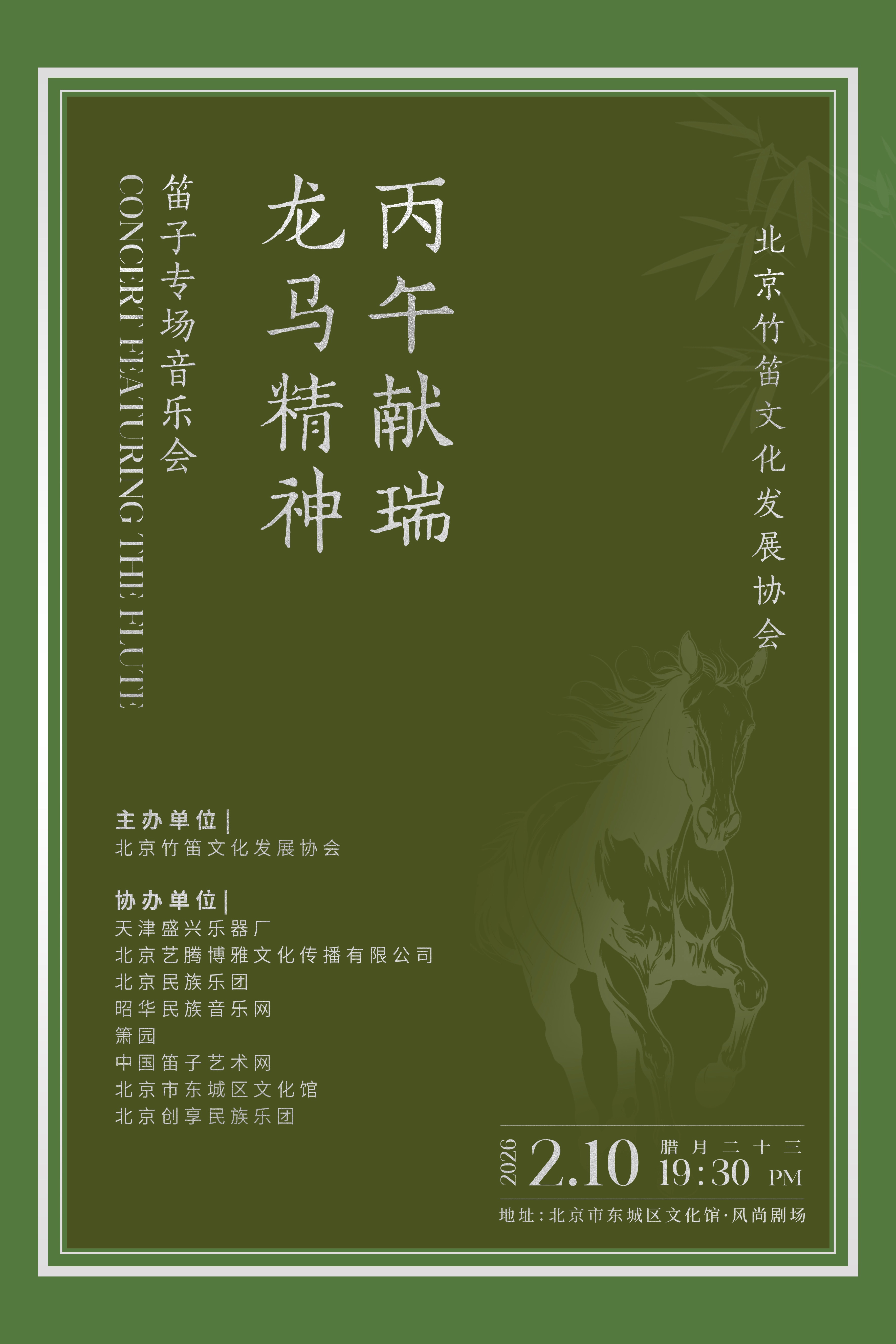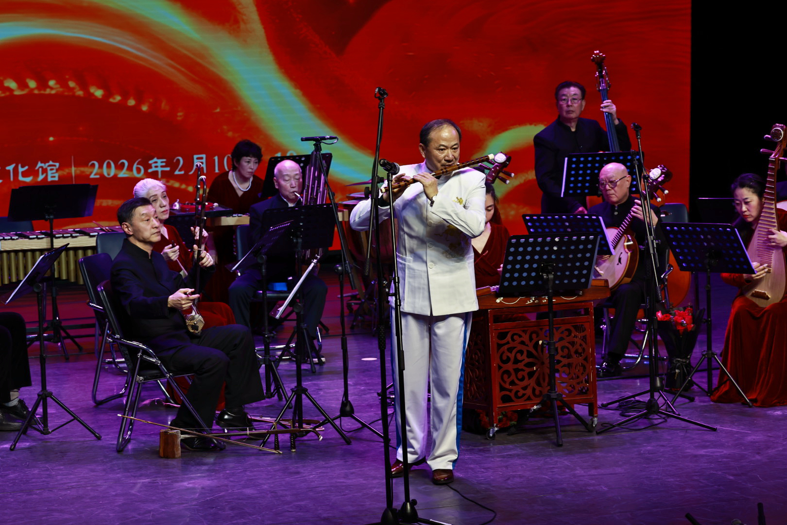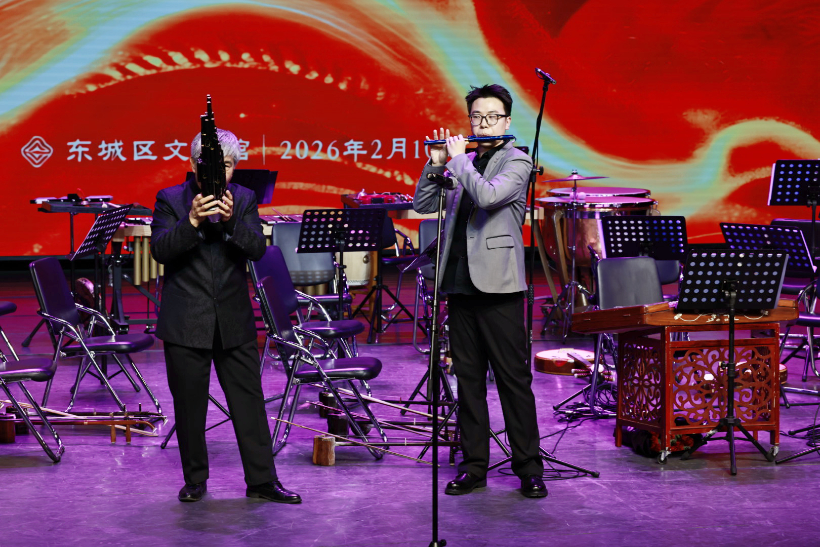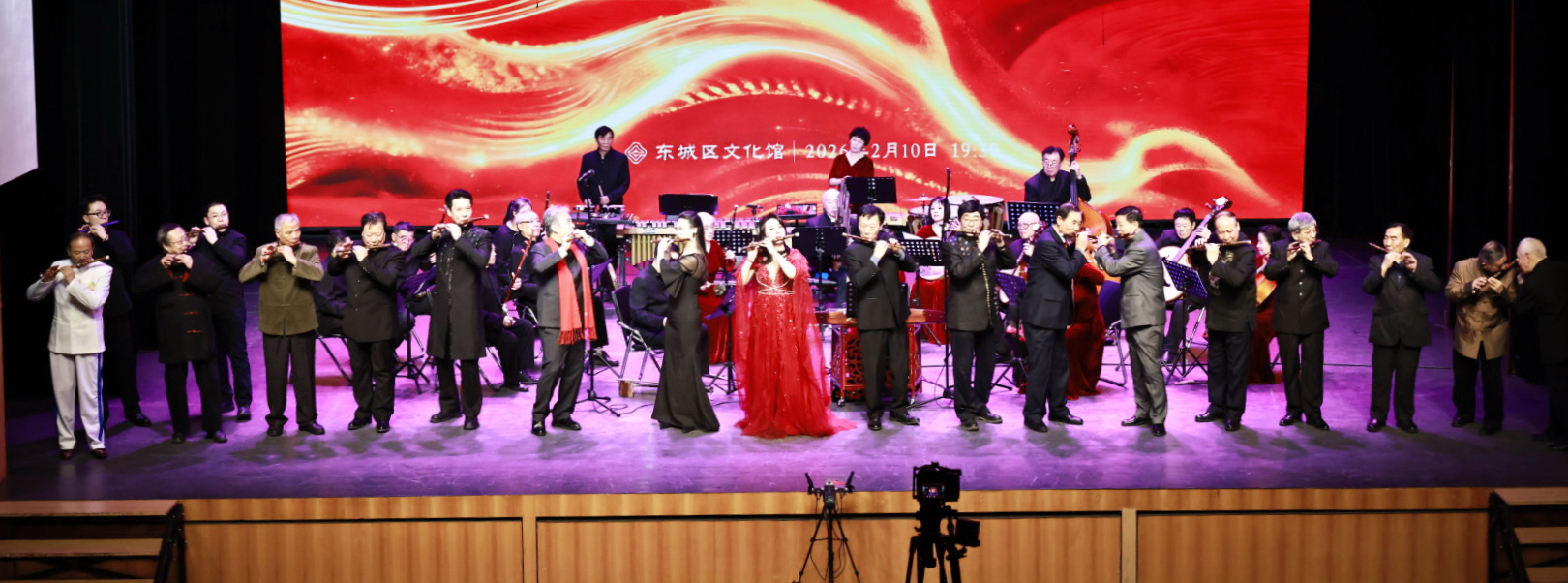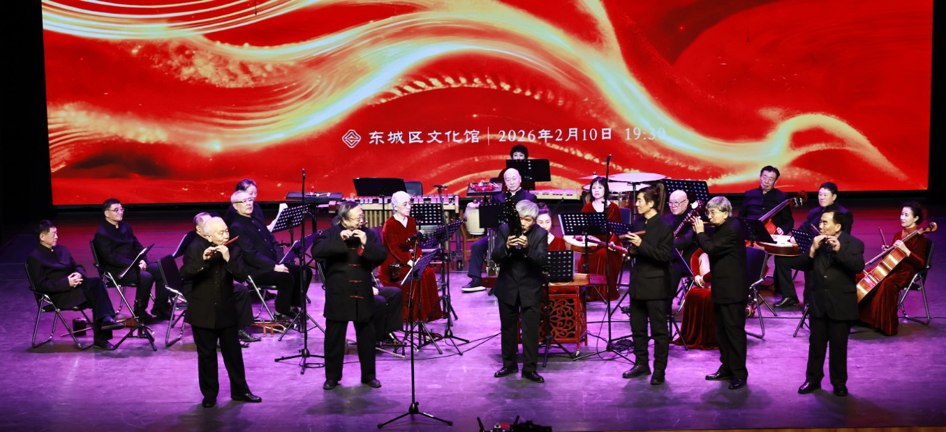 2026年2月10日,腊月二十三小年之夜,北京市东城区文化馆·风尚剧场灯火璀璨、座无虚席。由北京竹笛文化发展协会主办,天津盛兴乐器厂、北京艺腾博雅文化传播有限公司、北京民族乐团等单位协办的“龙马精神 丙午献瑞”笛子专场音乐会圆满收官,老中青三代笛乐人齐聚一堂,用15首经典曲目奏响新春序曲,为现场观众带来一场浸润心灵的笛乐盛宴。