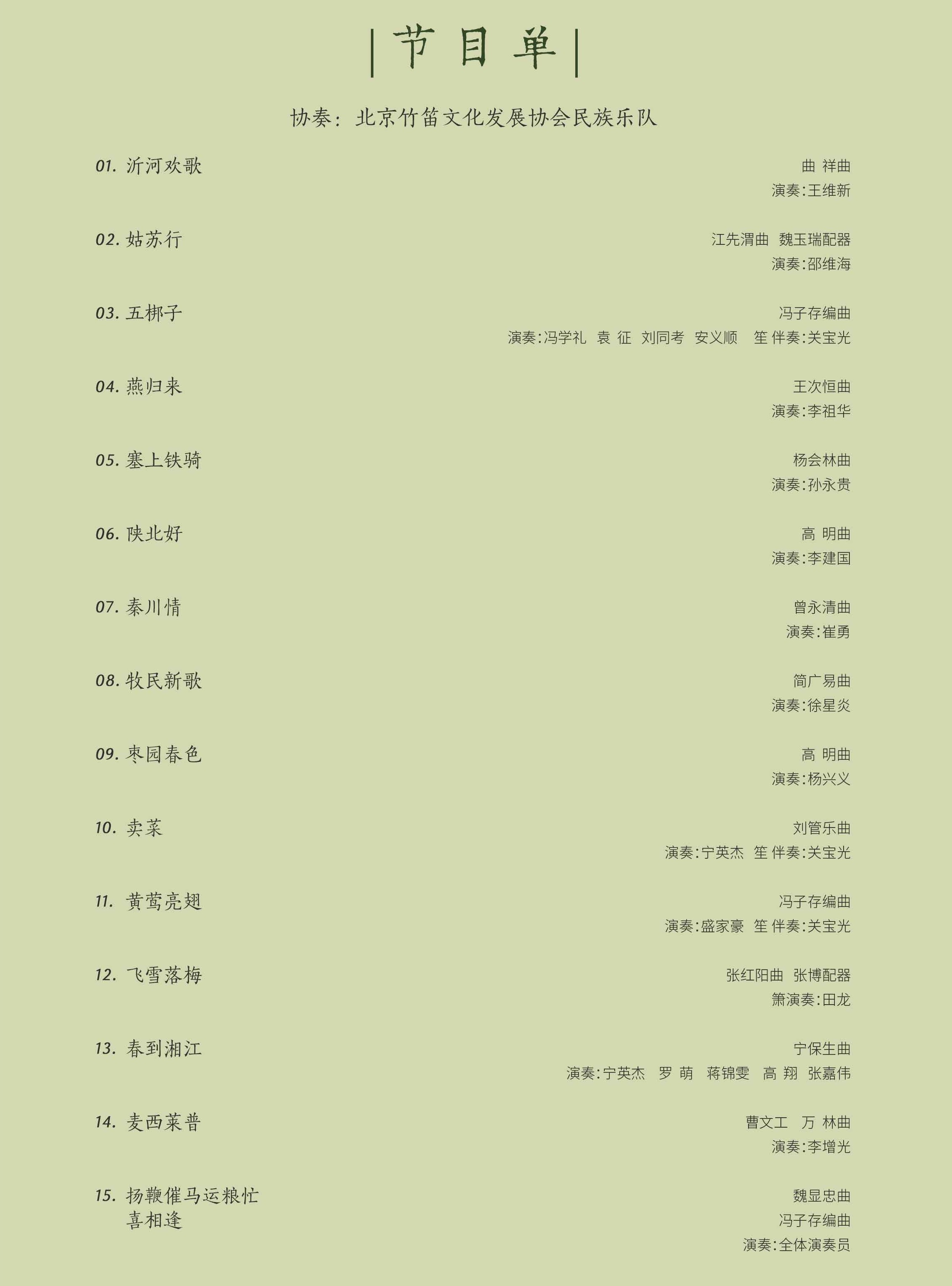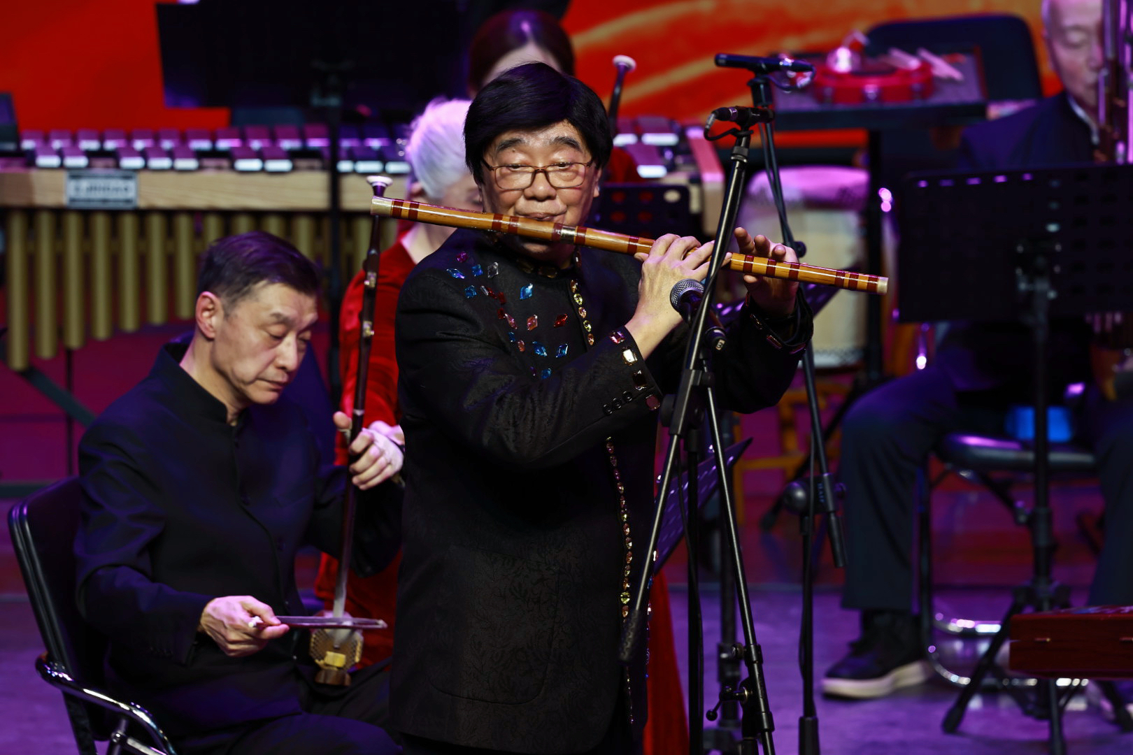乐队休整期间,两首笙伴奏曲目别具韵味。北京竹笛文化发展协会副秘书长、北京民族乐团笛子首席宁英杰,以《卖菜》惟妙惟肖展现北方竹笛技法的灵动;冯子存先生的外孙、协会副秘书长盛家豪带来外祖父的经典之作《黄莺亮翅》,箫笛和鸣间再现黄莺振翅的灵动景象,关宝光先生的笙伴奏相得益彰。