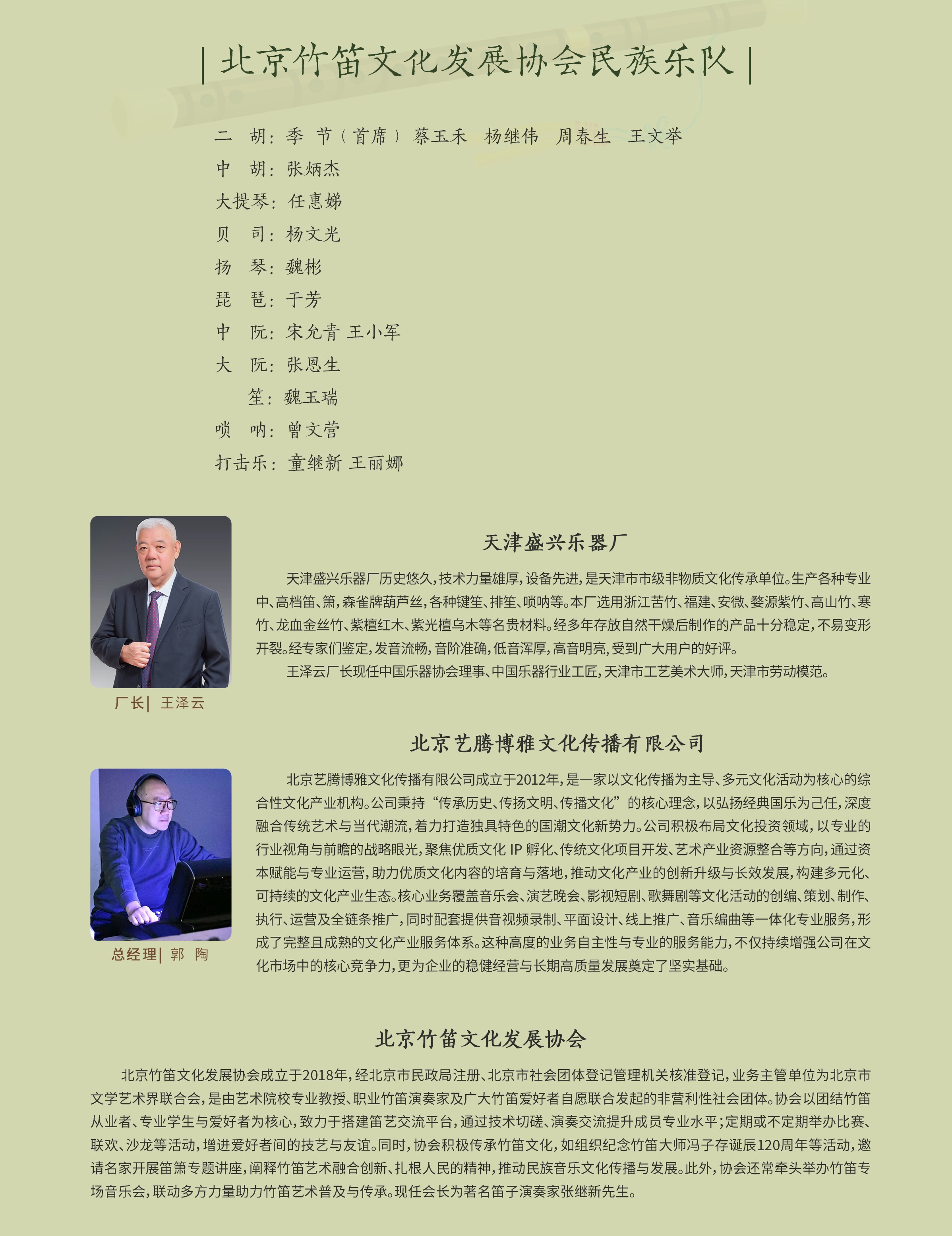 此次音乐会的成功举办,离不开北京竹笛文化发展协会的精心策划——张继新会长担任总策划,副会长兼秘书长冯彬担任导聆,魏玉瑞负责指挥配器,北京竹笛文化发展协会民族乐队全程保驾护航。天津盛兴乐器厂与北京博雅音画倾情支持,更让竹笛文化得以广泛传播。